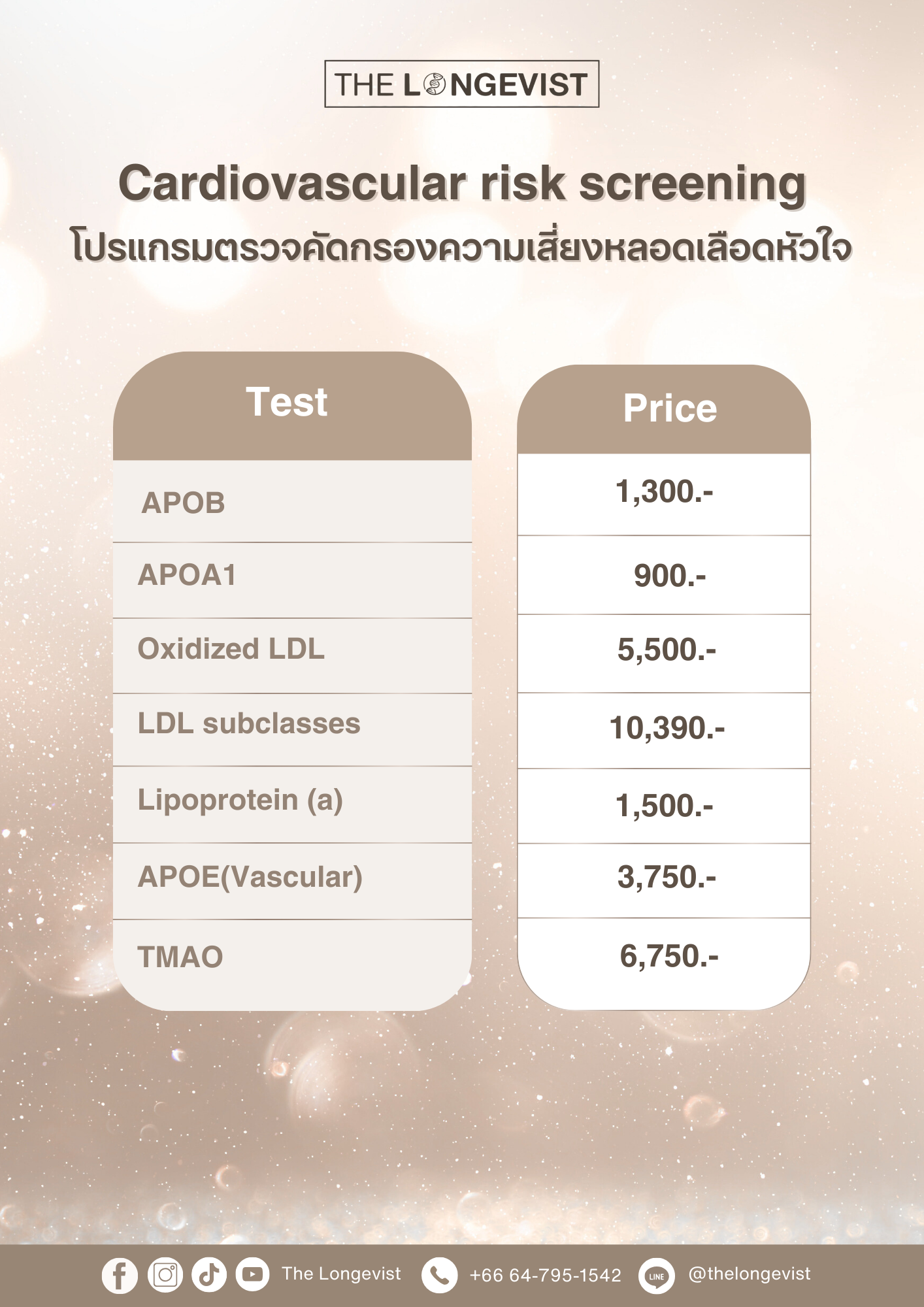 ![]() | การตรวจคัดกรองโรคหัวใจและหลอดเลือดที่ The Longevist Clinic โรคหัวใจและหลอดเลือดเป็นสาเหตุการเสียชีวิตอันดับต้นๆ ของโลก และมักเกิดขึ้น โดยไม่มีอาการเตือนล่วงหน้า ที่ The Longevist Clinic เราให้บริการ ตรวจสุขภาพหัวใจขั้นสูง ซึ่งครอบคลุม ไขมันในเลือดที่ซับซ้อน การอักเสบ และตัวชี้วัดจากลำไส้ (TMAO) เพื่อช่วยประเมินความเสี่ยง ตั้งแต่ระยะเริ่มต้นและออกแบบแผนป้องกันสุขภาพหัวใจแบบเฉพาะบุคคล การตรวจวิเคราะห์ประกอบด้วย: 1. โปรไฟล์ไขมันขั้นสูง (Advanced Lipid Profile) (เจาะลึกมากกว่าการตรวจคอเลสเตอรอลทั่วไป) LDL Particle Number (LDL-P) – วัดจำนวนอนุภาค LDL ที่เป็นอันตราย ซึ่งแม่นยำกว่าค่า LDL-C Apolipoprotein B (ApoB) – เป็นตัวบ่งชี้ที่แม่นยำกว่าคอเลสเตอรอลในการคาดการณ์ความเสี่ยงของโรคหัวใจ Lipoprotein (a) [Lp(a)] – ปัจจัยเสี่ยงทางพันธุกรรมที่ไม่สามารถตรวจพบได้จากการตรวจไขมันในเลือดทั่วไป HDL Subtypes – วิเคราะห์ชนิดของ HDL และความสามารถในการปกป้องหลอดเลือด Triglyceride-to-HDL Ratio – ช่วยบ่งชี้ภาวะดื้ออินซูลินและความเสี่ยงของโรคหัวใจ 2. ตัวชี้วัดการอักเสบและสุขภาพหลอดเลือด (ประเมินความแข็งแรงของหลอดเลือดแดง) C-Reactive Protein (CRP-hs) – ตัวบ่งชี้หลักของการอักเสบในหลอดเลือด 3. การเชื่อมโยงระหว่างลำไส้และโรคหัวใจ (TMAO – Trimethylamine-N-Oxide) TMAO (Trimethylamine-N-Oxide) – สารจากลำไส้ที่สัมพันธ์กับความเสี่ยงของโรคหัวใจและการเกิดคราบไขมันในหลอดเลือด ระดับสูงบ่งบอกถึงภาวะไมโครไบโอมไม่สมดุลและการบริโภคอาหารที่มีโคลีนสูง (เช่น เนื้อแดง ไข่ และผลิตภัณฑ์จากสัตว์) 4. ภาวะดื้ออินซูลินและตัวชี้วัดเมตาบอลิซึม Fasting Insulin & HOMA-IR (Insulin Resistance Index) – ภาวะดื้ออินซูลินเพิ่มความเสี่ยงของโรคหัวใจ HbA1c – วัดระดับน้ำตาลเฉลี่ยย้อนหลัง 3 เดือน Homocysteine – ระดับสูงสัมพันธ์กับภาวะอักเสบและการสะสมคราบไขมันในหลอดเลือด 5. สมดุลของโอเมก้า 3 และกรดไขมัน (ลดการอักเสบและปกป้องหัวใจ) Omega-3 Index – วัดระดับ EPA และ DHA ซึ่งมีผลต่อการลดการอักเสบ Omega-6 to Omega-3 Ratio – ความไม่สมดุลของกรดไขมันโอเมก้าอาจเพิ่มความเสี่ยงของโรคหัวใจ ใครบ้างที่ควรตรวจคัดกรองโรคหัวใจและหลอดเลือด? ผู้ที่มี ประวัติครอบครัวเป็นโรคหัวใจ หลอดเลือด หรือความดันโลหิตสูง ผู้ที่มี ระดับไขมันในเลือดสูง ภาวะดื้ออินซูลิน หรือเมตาบอลิกซินโดรม ผู้ที่ต้องการ ป้องกันโรคหัวใจและเพิ่มสมรรถภาพของระบบหลอดเลือด ผู้ที่บริโภค อาหารที่มีโปรตีนสูงหรือเนื้อแดงเป็นประจำ และต้องการตรวจระดับ TMAO 📅 นัดหมายตรวจ Cardiovascular Screening วันนี้ เพื่อหัวใจที่แข็งแรงและอายุที่ยืนยาว! |