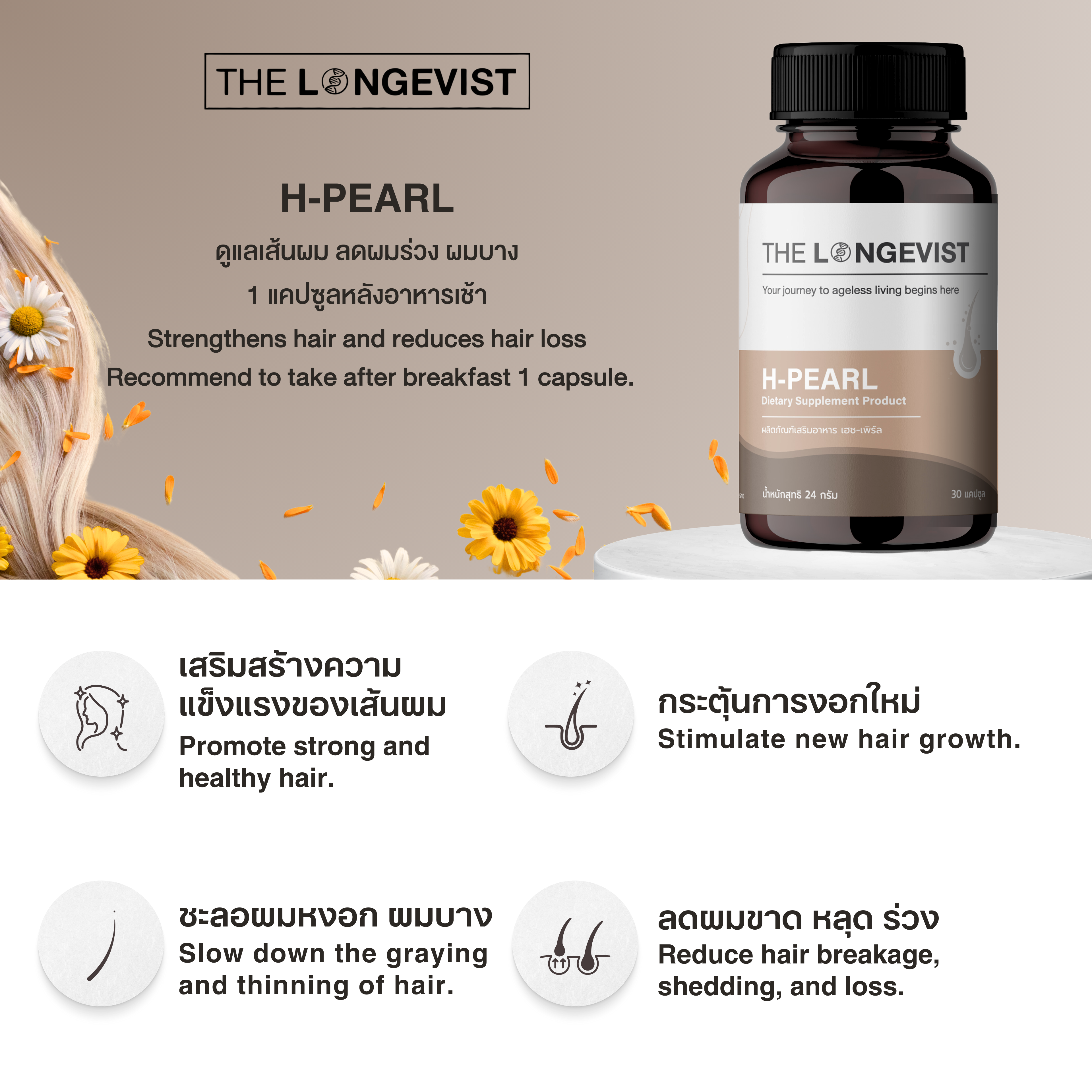 H-Pearl วิตามินบำรุงผมที่คิดค้นมาเพื่อดูแลสุขภาพเส้นผม และลดการหลุดร่วงของเส้นผมอย่างตรงจุด ด้วยส่วนผสมของวิตามินและแร่ธาตุที่จำเป็นต่อการสร้างเคราติน เพิ่มความแข็งแรงจากโคนจรดปลาย เหมาะสำหรับผู้มีปัญหาผมบาง ผมร่วง ผมหงอกก่อนวัย หรือผมแห้งเสียจากการทำเคมี