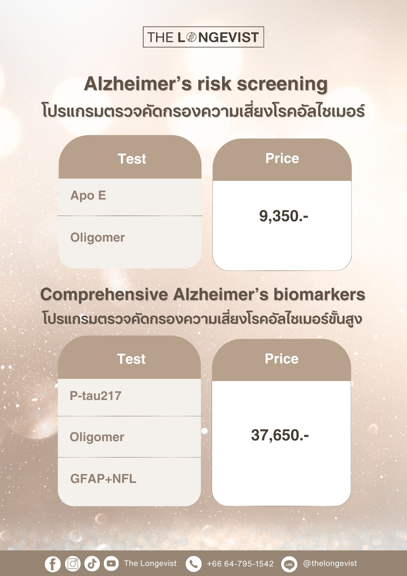 ![]() | Comprehensive Alzheimer’s Biomarkers Alzheimer’s disease is a progressive neurodegenerative condition that affects memory, cognition, and daily functioning. While genetics do contribute to the risk, key factors such as metabolic imbalance, chronic inflammation, and abnormal protein accumulation (Tau and Amyloid Beta) also play a significant role. At The Longevist Clinic, our Comprehensive Alzheimer’s Biomarkers screening evaluates a range of biological indicators—including genetic markers, metabolic and inflammatory pathways, and neurodegenerative proteins—to help identify risks early and guide brain longevity strategies tailored to you. 🧪 Your Evaluation Includes:🧠 P-tau217 (Phosphorylated Tau 217) 🧬 Amyloid Beta Oligomers 🔬 GFAP + NFL (Glial Fibrillary Acidic Protein & Neurofilament Light Chain)