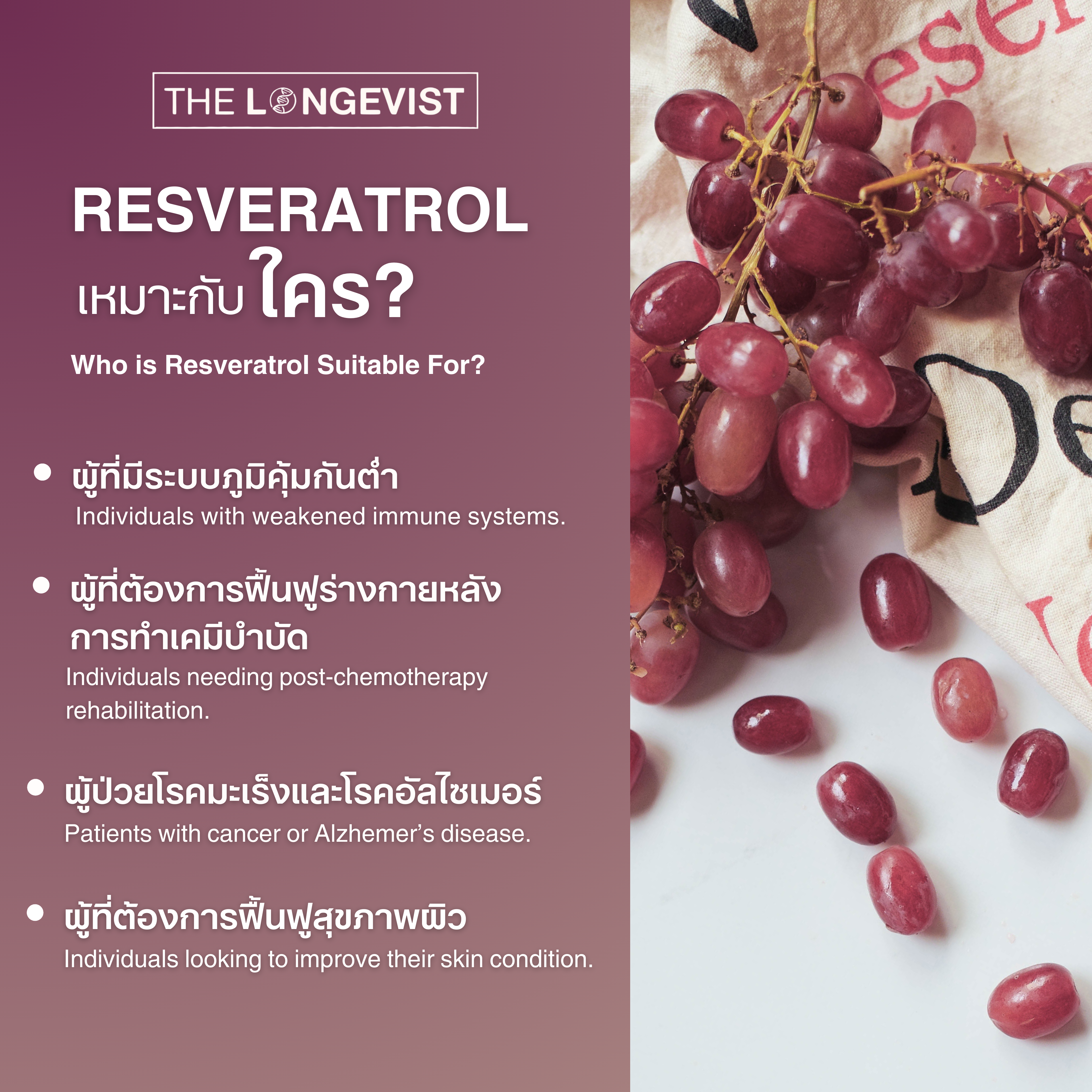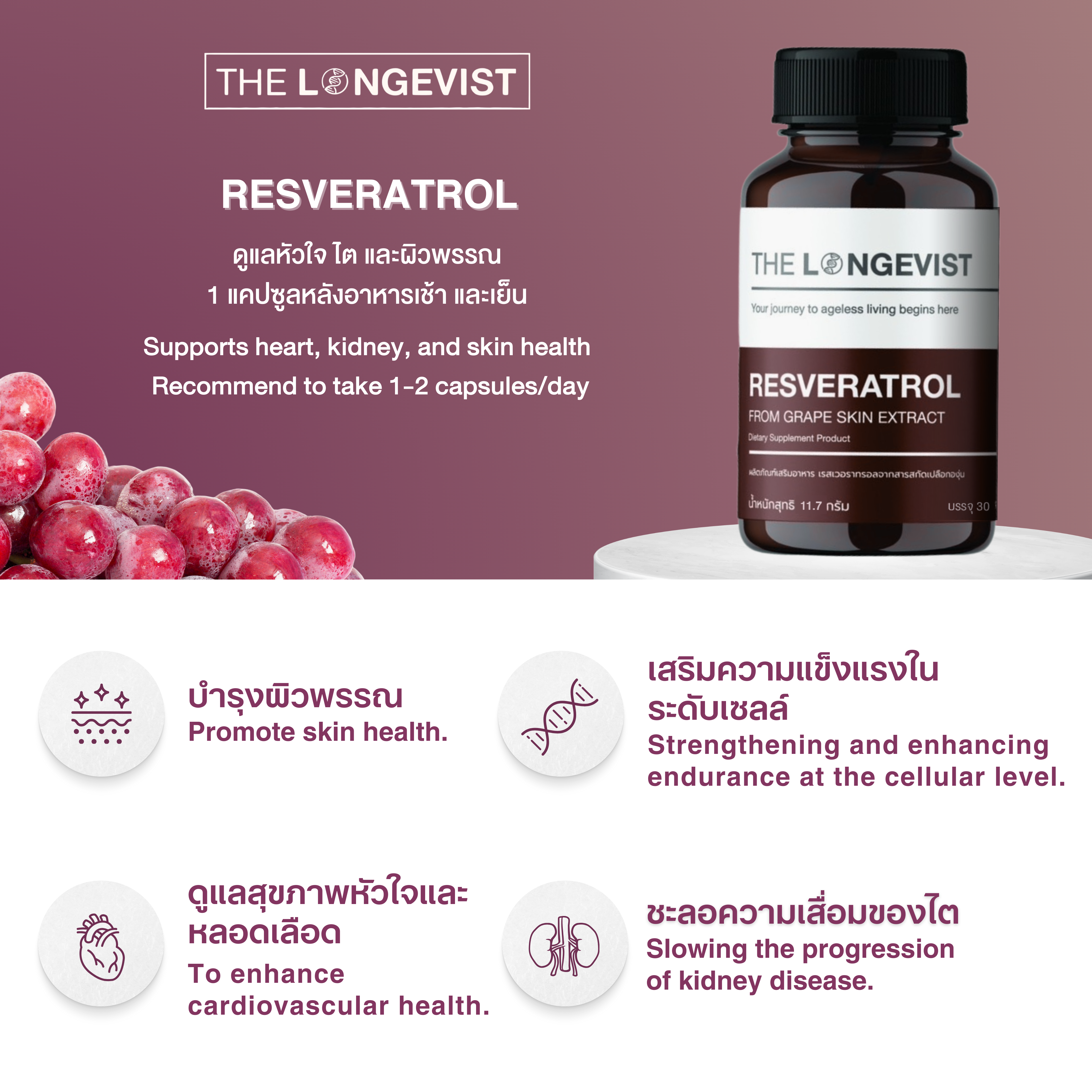 Resveratrol is an extract from red grape skins that has gained significant attention in the health community. It helps maintain heart, kidney, and vascular health by strengthening and enhancing cellular resilience. It also fights free radicals and inflammation in the body, supports the immune system, slows down aging, promotes longevity, delays brain degeneration, prevents Alzheimer's, and enhances skin health.