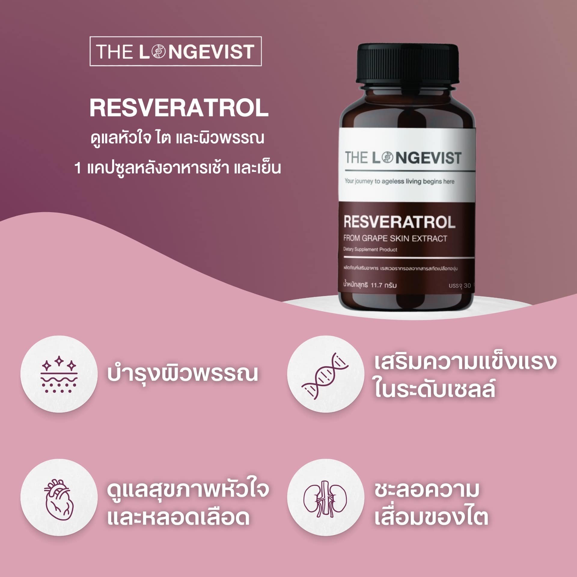 Resveratrol is an extract from red grape skins that has gained significant attention in the health community. It helps maintain heart, kidney, and vascular health by strengthening and enhancing cellular resilience. It also fights free radicals and inflammation in the body, supports the immune system, slows down aging, promotes longevity, delays brain degeneration, prevents Alzheimer's, and enhances skin health.