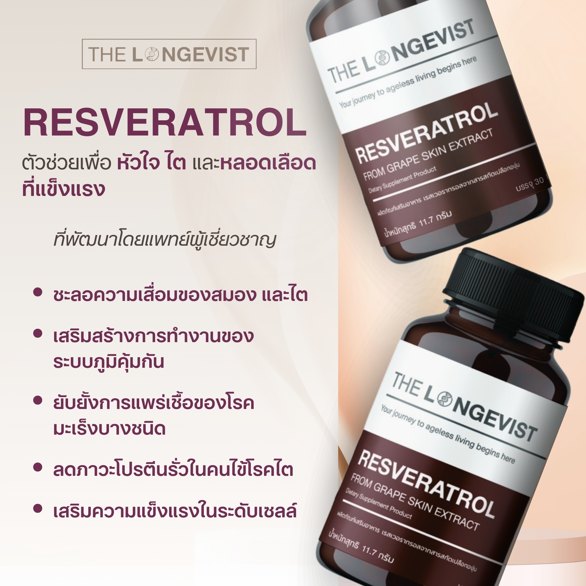 Resveratrol is an extract from red grape skins that has gained significant attention in the health community. It helps maintain heart, kidney, and vascular health by strengthening and enhancing cellular resilience. It also fights free radicals and inflammation in the body, supports the immune system, slows down aging, promotes longevity, delays brain degeneration, prevents Alzheimer's, and enhances skin health.