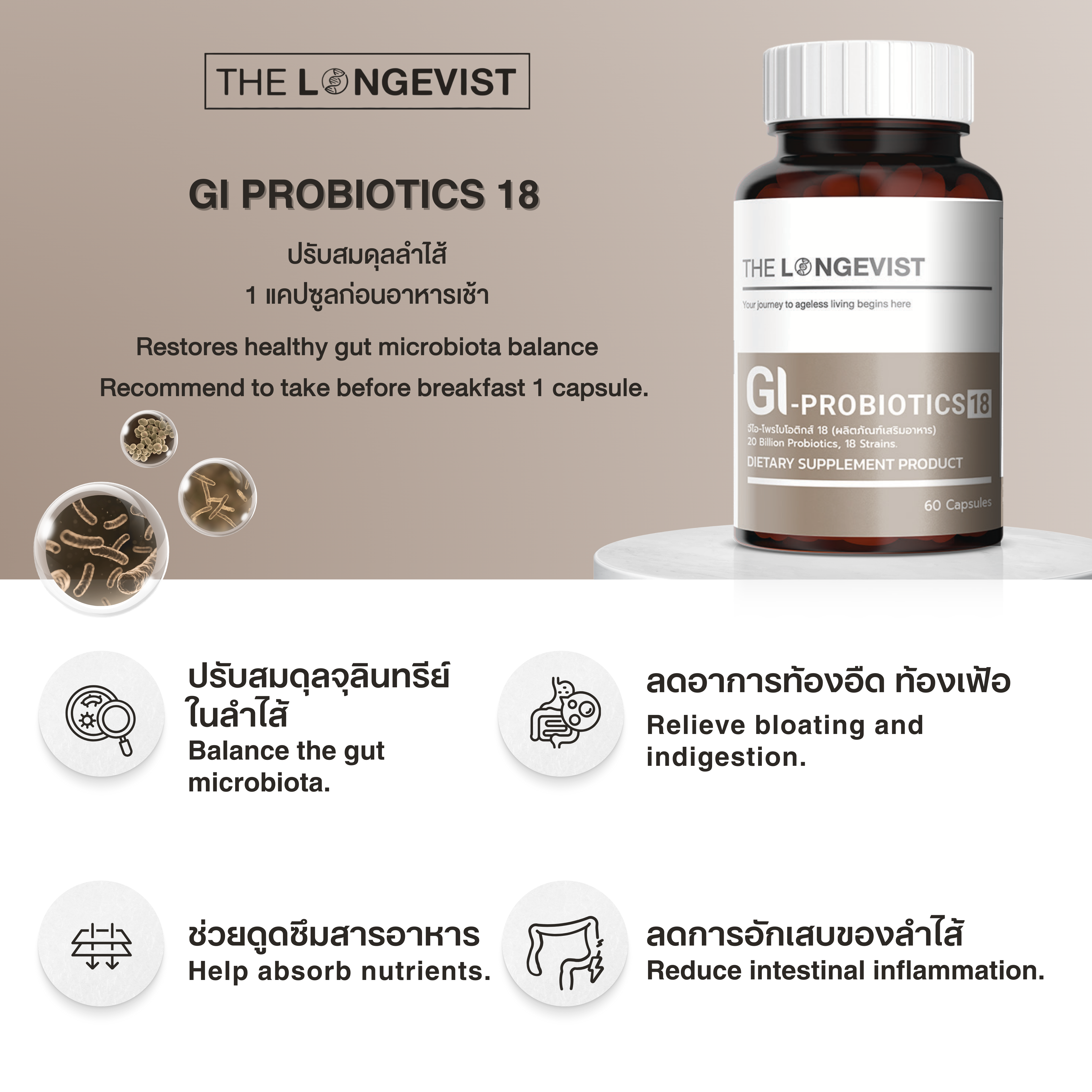 GI Probiotics 18 ผลิตภัณฑ์เสริมอาหารที่รวมจุลินทรีย์สายพันธุ์ดีมากถึง 18 ชนิด พร้อมพรีไบโอติก (ใยอาหาร) ที่ช่วยให้จุลินทรีย์ทำงานได้อย่างมีประสิทธิภาพ ช่วยปรับสมดุลลำไส้ ลดอาการท้องอืด ท้องเฟ้อ ระบบขับถ่ายไม่ปกติ และเสริมภูมิคุ้มกันจากภายใน