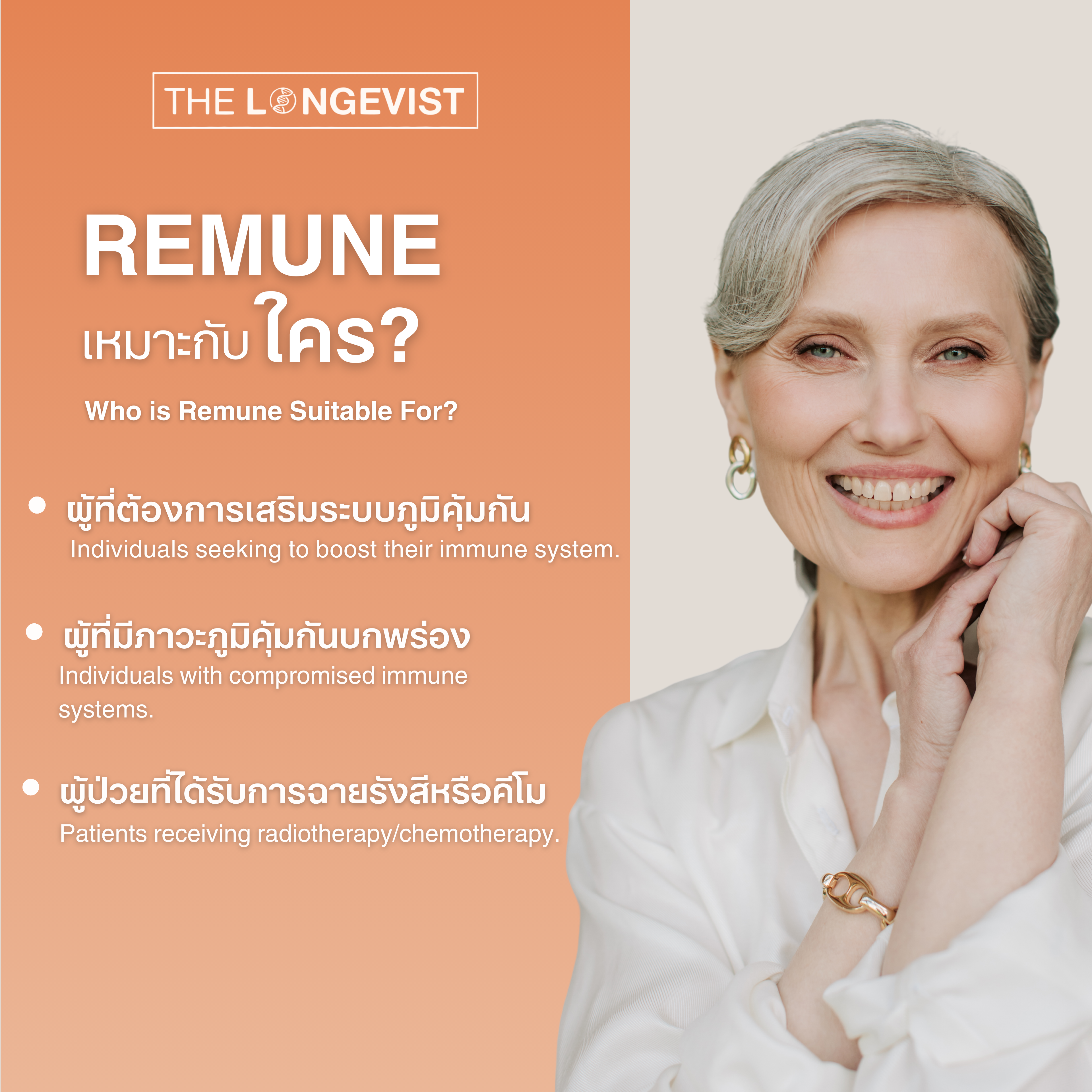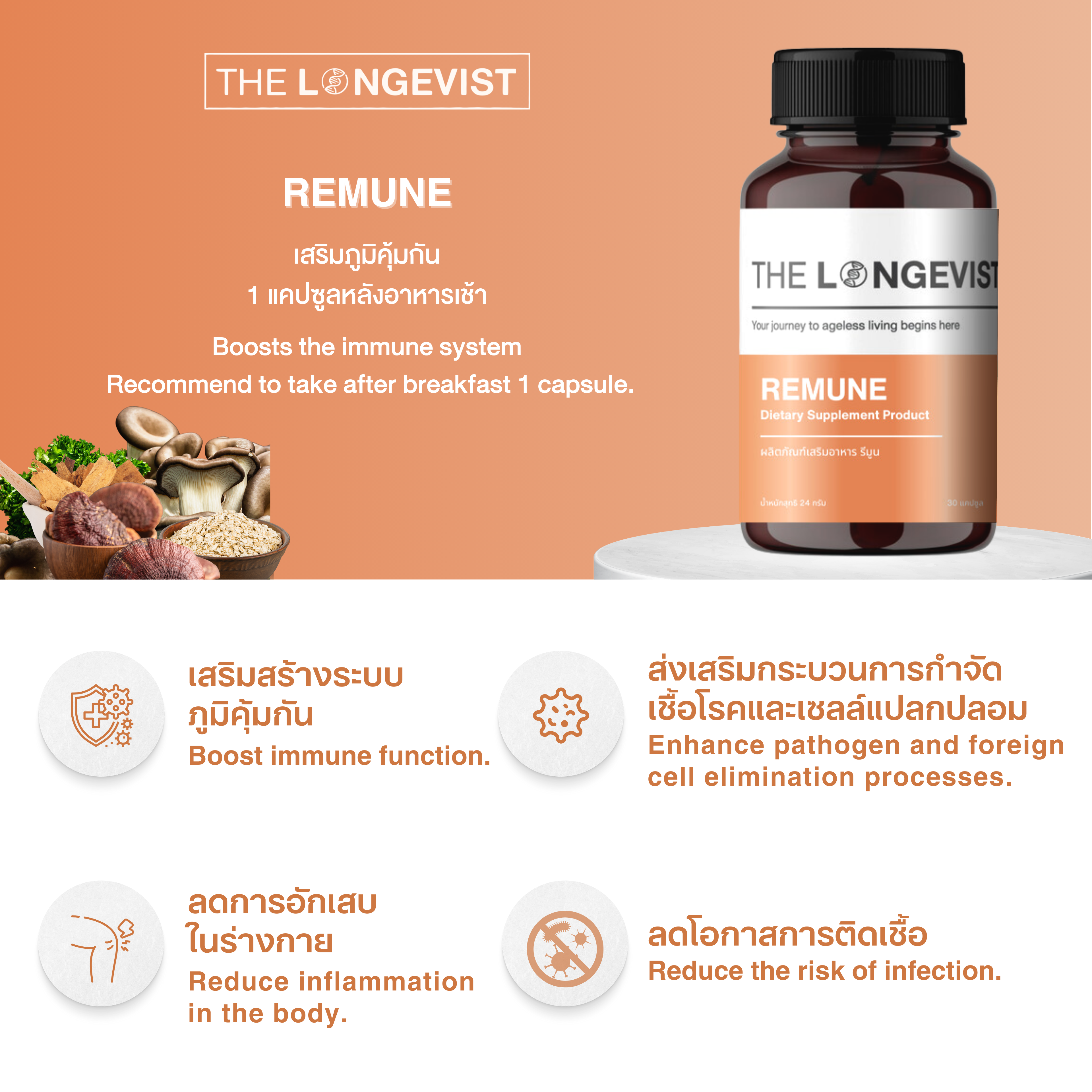 Remune ผลิตภัณฑ์เสริมอาหารที่พัฒนาขึ้นเพื่อเสริมสร้างภูมิคุ้มกันให้แข็งแรง ด้วยการผสานสารสกัดจากธรรมชาติหลากหลายชนิด เช่น เบต้ากลูแคน แอสทรากาลัส ขมิ้นชัน และแอสคอร์บิกแอซิด ช่วยกระตุ้นการทำงานของเซลล์ภูมิคุ้มกัน ลดโอกาสการเจ็บป่วยซ้ำ และฟื้นฟูร่างกายจากความเหนื่อยล้าเรื้อรัง